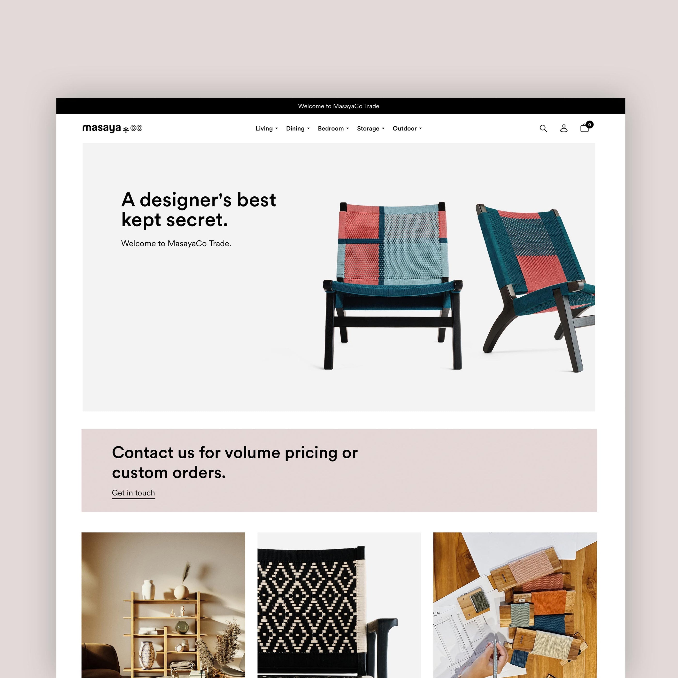 The best way to browse our trade catalog is through our exclusive trade website. Only registered users are able to access MasayaCo.Trade. Register today to get your unique user and password to visit the website and discover all available designs.